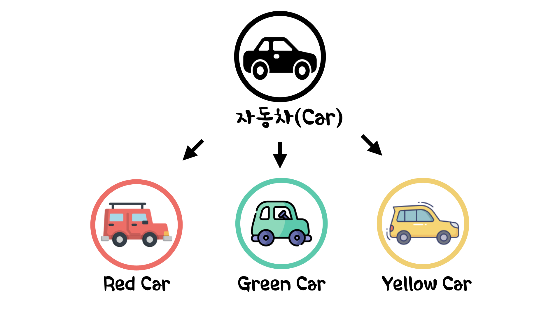 그럼 자동차로 예를 들어보자. 자동차는 사람들이 이동할 때 타는 운송수단이다. 그런데 자동차마다 가지는 기능, 색깔, 브랜드 등 특징들이 다 다르다. 이를 그림으로 표현해보면 이렇게 나타낼 수 있다.