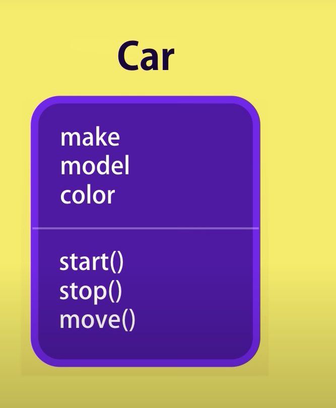 이렇게 model, make, color라는 속성(properry)과 start(), stop(), move()라는 메소드(method)를 정의해 놓으면 그래서 이 코드를 보면 함수를 위에서 정의해놓으면 객체를 정의할 때마다 같은 것을 또 정의하지 않고도 사용할 수 있다. (parameter들을 줄일 수 있다.) 또한 객체의 내부에 함수를 넣으므로 어떻게 실행되는지 외부에서 알 수없고, 직접적인 접근을 차단할 수 있다.