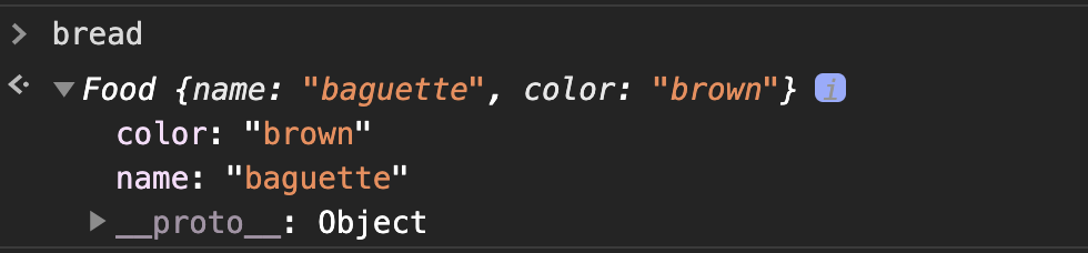 하지만 __proto__ 속성을 펼쳐보면 Food의 프로토타입객체를 가리킨다는 것을 확인할 수 있다.